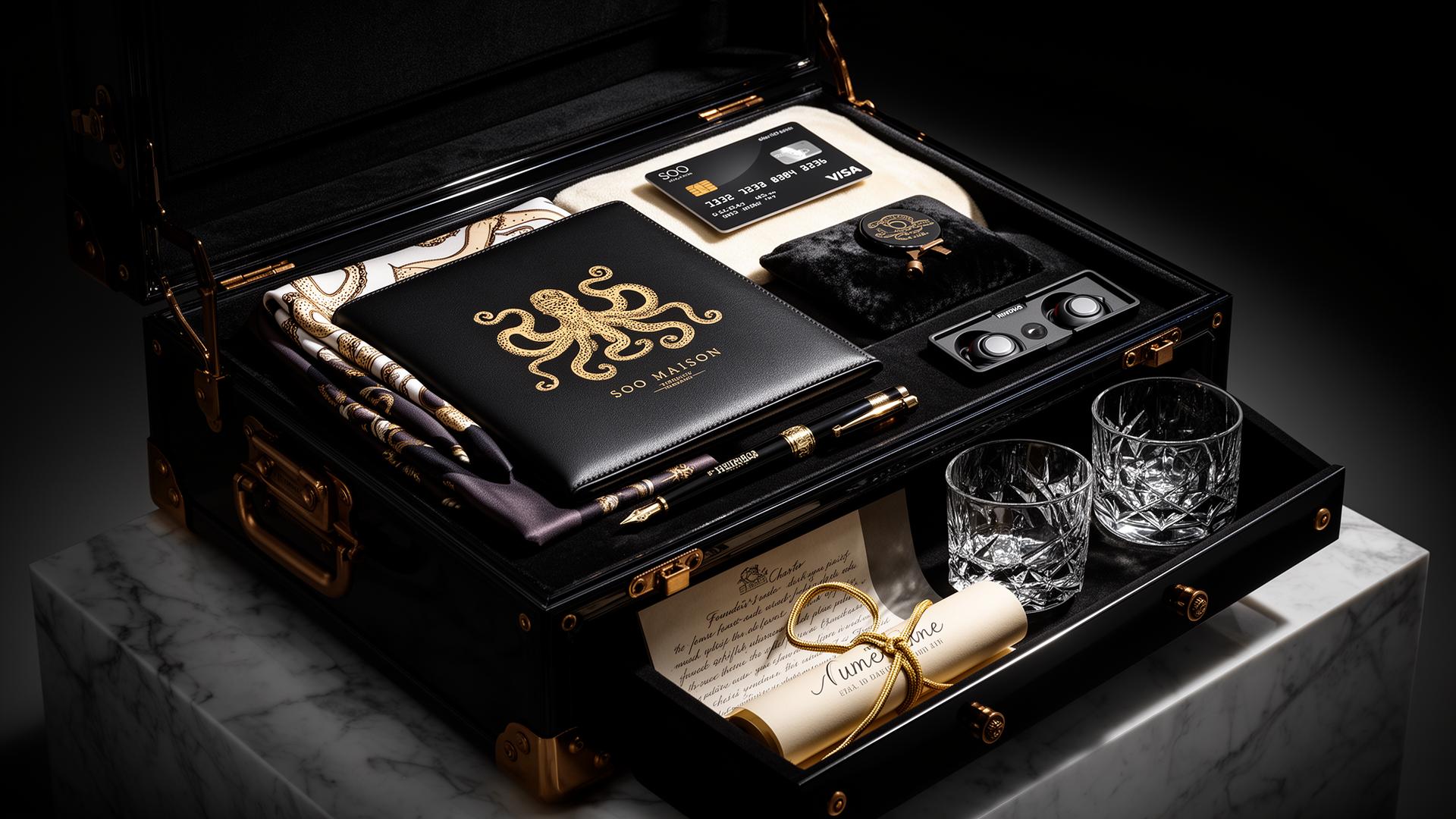 Every item is functional: the card spends, the pen signs the charter, the IEMs mix masters, the key opens the atelier door. Nothing ornamental.